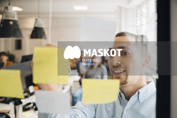 Manlig programmerare fäster post-it på tavla under möte med kollegor