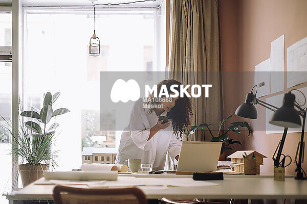 Kvinnlig arkitekt håller i smartphone på kontor